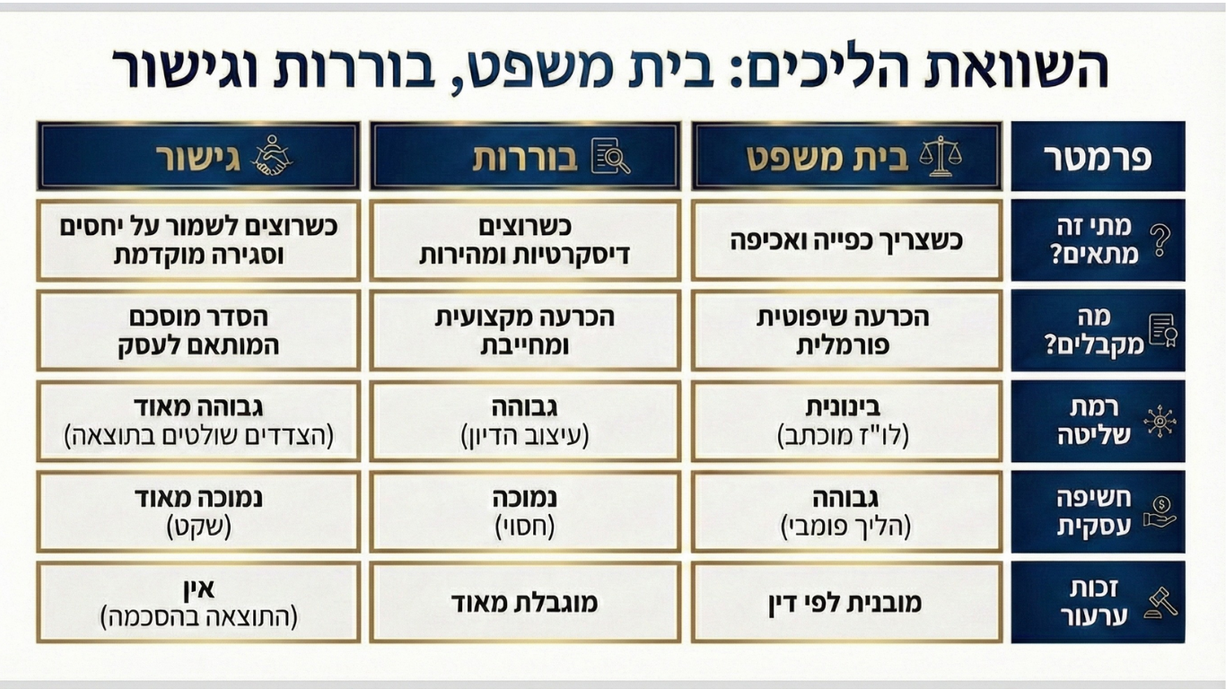 בשורה התחתונה, המטרה היא לבחור מסלול שיביא אתכם לסיום הסכסוך בדרך שמשרתת את העסק בצורה הטובה ביותר. להלן טבלת השוואה בין הערכאות השונות: